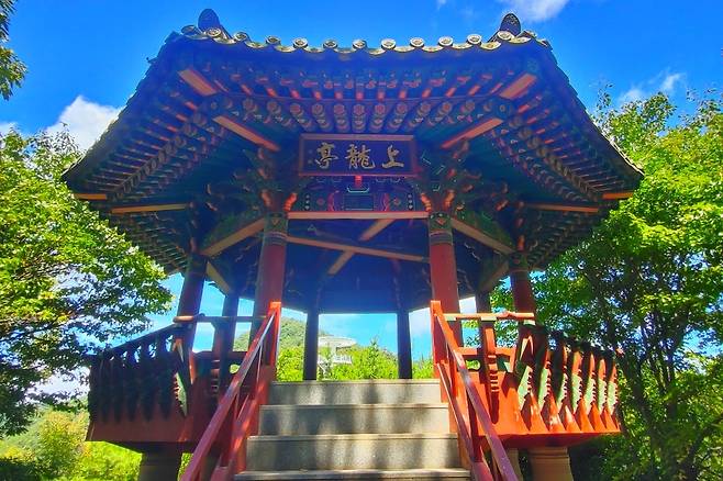고갯마루 정상에는 작은 쉼터 **상용정(常用亭)**이 자리합니다. 2002~2003년 태풍 피해 복구 사업 중 세워진 팔각정으로, 우리나라 소나무와 화강암으로 지어져 전통의 멋이 살아 있습니다. 정자의 초석에는 국악기 ‘대금’ 문양이 새겨져 있어, 국악의 고장 영동의 상징을 품고 있죠. 이곳에 서면 사방으로 펼쳐지는 능선과 골짜기, 그리고 멀리 무주 방면의 산줄기까지 한눈에 담을 수 있습니다. 특히 가을의 상용정은 붉은 단풍과 황금빛 들녘이 어우러져, 그야말로 그림 같은 풍경을 선사합니다.