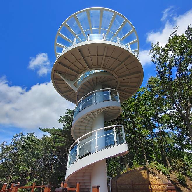 2024년 5월 문을 연 도마령 전망대는 영동군 상촌면 고자리와 용화면 조동리를 잇는 국가지원지방도 49호선 구간에 새롭게 자리했습니다. 해발 840m, 높이 14m의 나선형 구조로 설계된 전망대는 옥상 루프탑까지 이어지는 계단을 따라 올라가면 민주지산과 백화산, 그리고 멀리 무주 방면의 능선까지 한눈에 조망됩니다. 가을에는 붉게 물든 산맥이 굽이굽이 이어지고, 아침 햇살에 물든 운무가 골짜기를 감싸며 그 풍경은 마치 한 폭의 수묵화 같습니다.