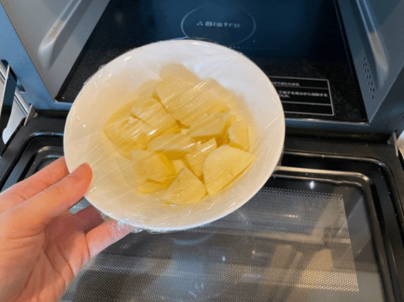 썬 감자는 전자레인지에 익히기 전 용기에 담고 랩을 씌워 수분이 날아가지 않도록 한다. 이렇게 5분 정도 전자레인지에 돌려주면 감자가 충분히 익고 으깨기 좋은 상태가 된다. 수분이 과하게 빠지지 않으면서도 고르게 익는 것이 중요하다.