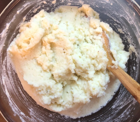 으깬 감자에 전분과 간을 더해 쫀득한 반죽 만들기