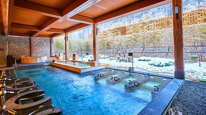 28℃~30.9℃ 온도의 온천은 약알칼리 성분을 자랑하며 피부에 닿는 순간 부드럽고 미끈한 감촉을 줍니다. 물결 위로 내리는 눈과 함께, 산자락의 공기가 고요하게 어우러져 온천의 매력을 더합니다.