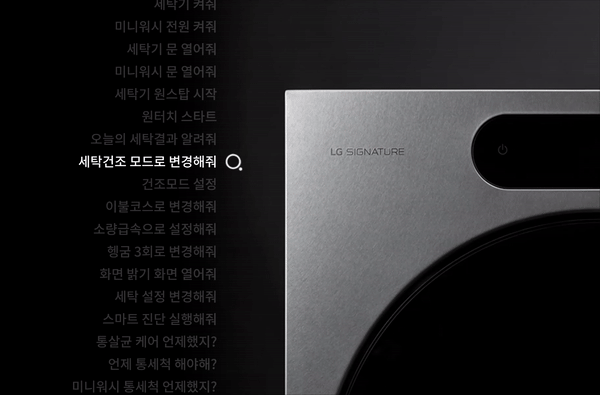 문을 음성으로 여는 것도 가능해졌습니다. "하이 엘지, 문 열어줘"하면 세탁기 문을 열 수도 있고 세탁코스 설정, 세탁결과 브리핑까지 음성으로 제어가 가능한 AI 세탁비서(음성인식) 기능이 탑재되었습니다.