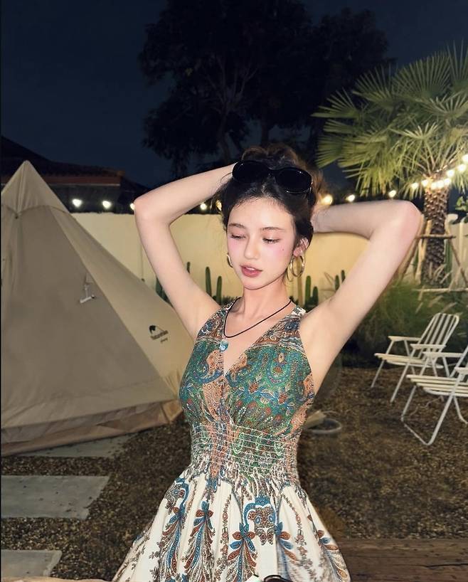NJZ(뉴진스) 다니엘이 보헤미안 감성과 청량한 패턴이 어우러진 룩으로 휴양지 무드를 완성했습니다.