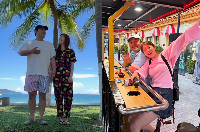 두 사람은 시원한 해변 아래, 야자수 그늘에서 손을 꼭 잡고 선 모습부터, 특유의 유쾌함이 묻어나는 커플 바이크 바 투어, 그리고 현지식 바게트 먹방까지, 진짜 ‘꽁냥꽁냥’ 신혼여행을 그대로 옮겨왔다.
