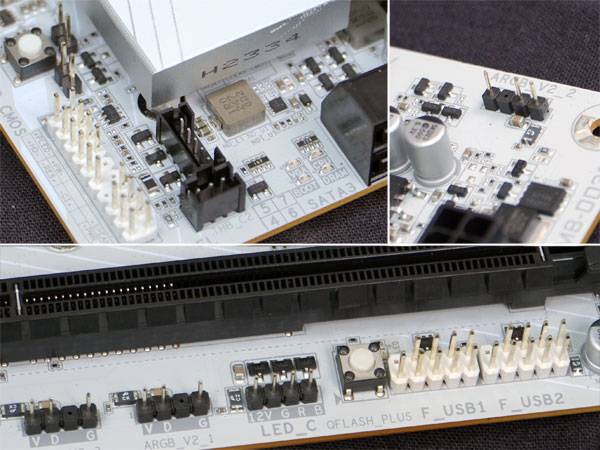 최신 튜닝 트랜드를 따라잡기 위한 ARGB LED 헤더는 메모리 소켓쪽에 하나와 확장 슬롯 하단에 두 개, RGB LED 헤더 하나까지 총 네 개가 제공되며, CPU와 메모리 없이 전원 케이블만 연결한 상태로 바이오스 업데이트가 가능한 Q-Flash Plus 기능용 버튼도 갖췄다.