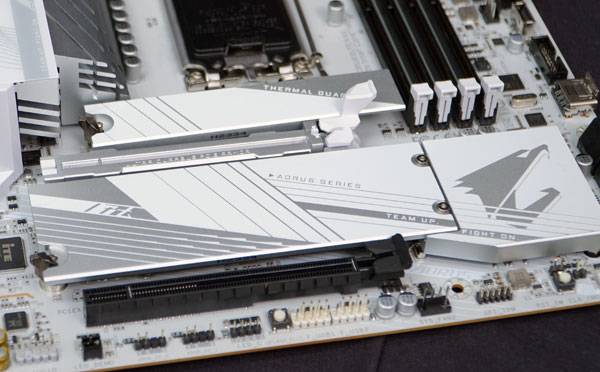 여기에 전작(B760M AORUS ELITE AX)에는 제공되지 않던 확장슬롯 사이의 PCIE 4.0 x4 M.2 소켓용, SSD 방열판을 더해 고속 스토리지의 성능 발휘에 더 쾌적한 환경을 제공한다.
