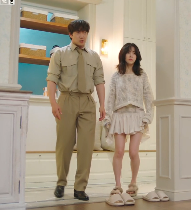여기에 미니 스커트와 함께 연출된 하의는 언밸런스 컷팅으로 개성을 살렸고, 실내 장면에서 살짝 드러난 퍼 샌들은 룩에 귀여움을 더해주었다.