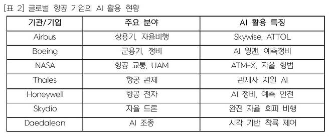 항공 분야에서 AI 기술을 선도하는 기관과 기업은 민간, 공공, 연구 기관을 망라해 빠르게 확장 중이며, 특히 자율비행, 예측 정비, 도심 항공 모빌리티, 항공 교통 관리 등에서 AI를 핵심 기술로 채택하고 있다 (표 2).