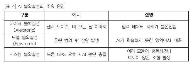 우리가 AI를 믿고 쓰기에는 아직 난제들이 많이 남아 있다. 무엇보다 AI의 불확실성에 의한 위험성을 해결해야 한다. AI 불확실성은 특히 드론, 항공, 자율 시스템처럼 안전이 중요한 분야에서 큰 위험 요소다. AI는 예측을 100% 확신할 수 없기 때문에, "내가 확실하지 않을 때 어떻게 행동할 것인가"를 정의하는 것이 매우 중요하다. 따라서 불확실성 문제의 유형과, 그것을 기술적·제도적·시스템적으로 해결할 필요가 있다 (표 4).