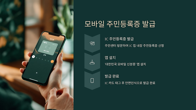 모바일 주민등록증 발급: 앱 내 '모바일 주민등록증' 메뉴를 선택한 후, IC 주민등록증을 스마트폰 뒷면에 접촉(태그)합니다.