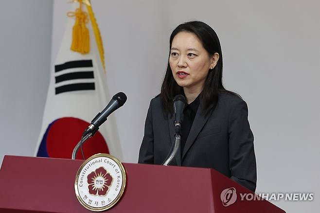 (서울=연합뉴스) 임화영 기자 = 이진 헌법재판소 공보관이 17일 오전 서울 종로구 헌법재판소 별관에서 윤석열 대통령 탄핵심판 관련 브리핑을 하고 있다. 2024.12.17