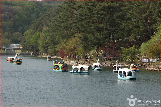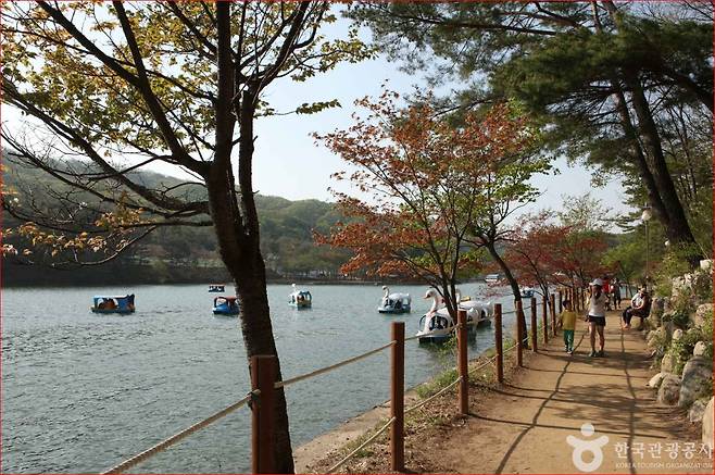 데크가 끝나면 다시 소나무와 참나무 숲길이 이어집니다. 흙길 위에 햇살이 나뭇잎 사이로 스며들고, 곳곳에 놓인 벤치가 발걸음을 쉬어가게 만듭니다. 아이들과 함께하는 가족, 나 홀로 산책하는 여행자 모두에게 이 숲길은 특별한 힐링을 선사합니다. 여름철에는 오리배가 호수를 가로지르며 풍경을 더하고, 가을이면 단풍이 호수에 비쳐 또 다른 풍경화를 완성합니다.