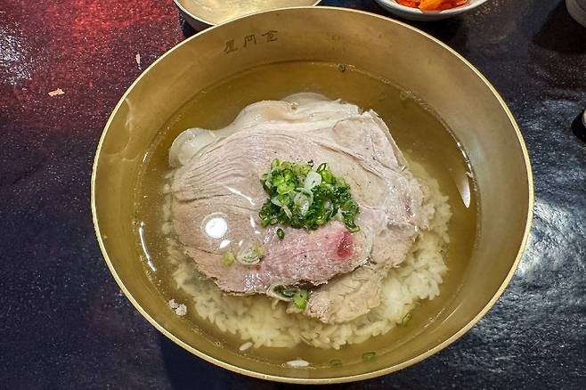 식은 밥과 80% 정도 익은 고기를 방짜유기(놋그릇)에 담은 후 그 위에 뜨거운 육수를 붓는 토렴 방식으로 국밥을 낸다. 뜨거운 국물 덕분에 고기는 마저 익으면서 국물과 조합을 이뤄 더욱 담백하고 진한 맛을 낸다. 이게 바로 옥동식 돼지곰탕의 모든 것. 물론 육수를 내고 고기를 다루는 데는 더 큰 노하우가 있을 것이다. 10석밖에 안 되는 작은 공간이고 하루에 판매할 수 있는 양이 한정이라 쉽게 먹을 수 있는 음식이 아니라는 것이 안타깝다.