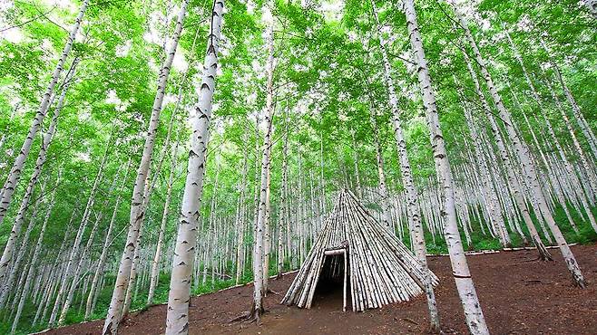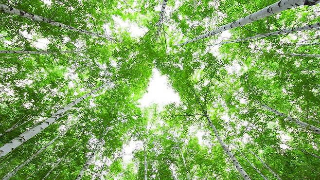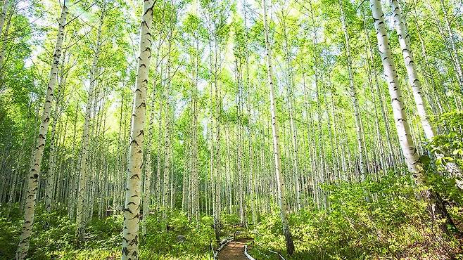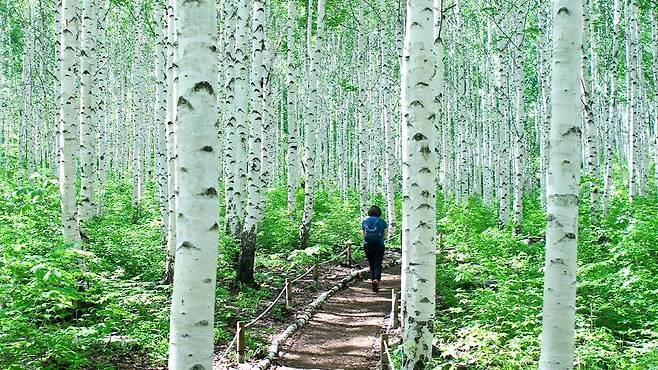 숲의 입구에 위치한 안내소를 시작으로 ‘원정 임도(80분 소요)’와 ‘원대 임도(60분 소요)’ 중 원하는 코스를 선택해 걷다 보면, 빽빽이 들어선 자작나무들이 자연의 아치를 만들며 무더위를 잊게 해준다.
