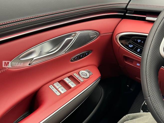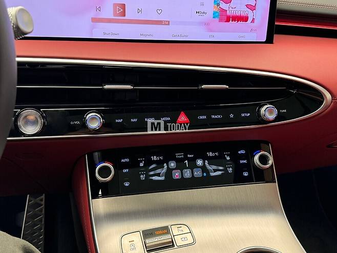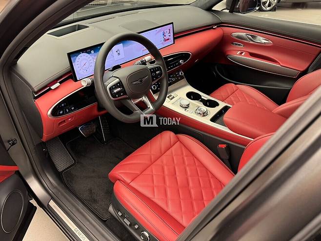 GV70 스포츠 패키지 실내는 27인치 통합형 와이드 디스플레이와 터치 타입 공조 조작계를 탑재해 진보된 느낌을 부각했다.