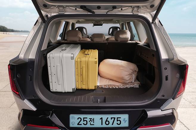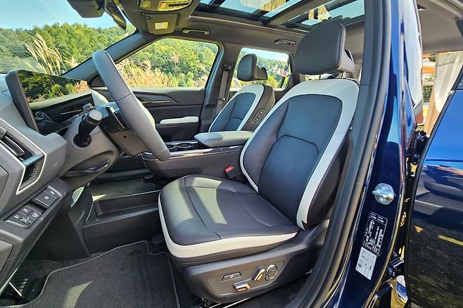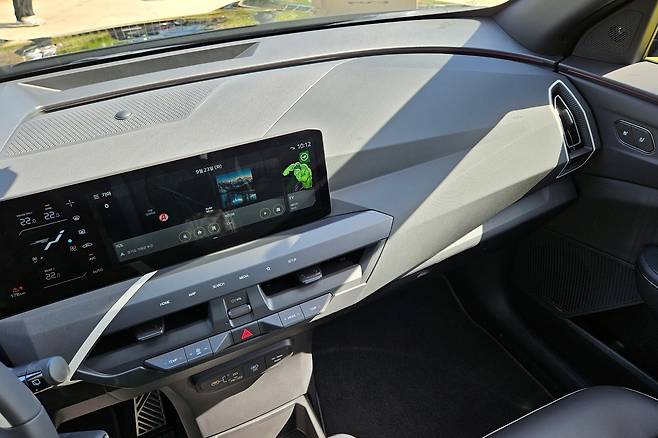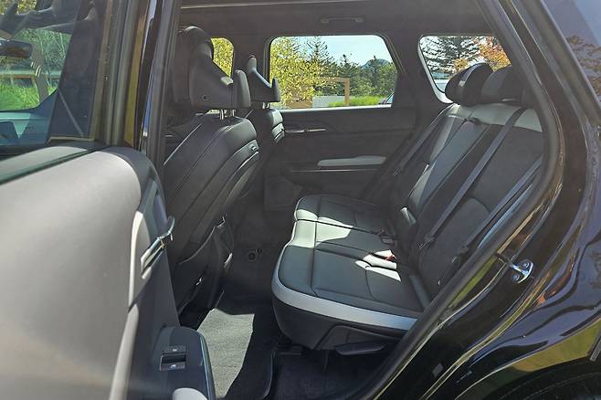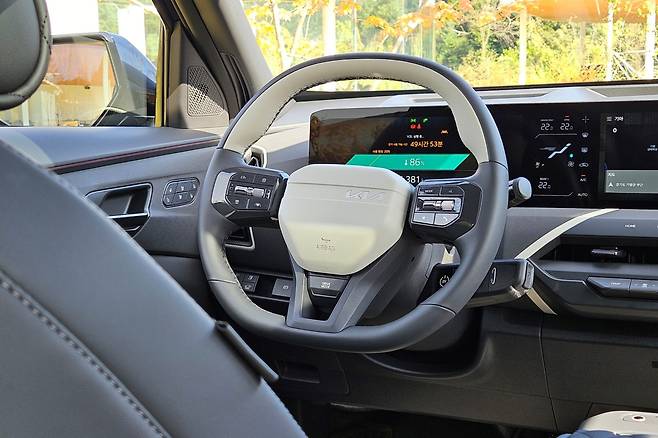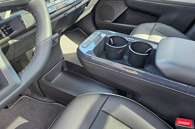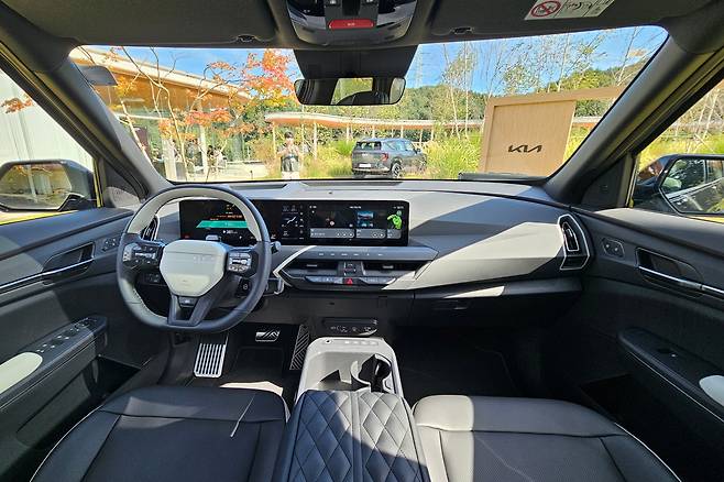 1열 생김새는 EV3·EV4·EV9과 결이 같다. 수평형 대시보드 위에 12.3-5-12.3인치 일체형 디스플레이를 얹고, 센터콘솔은 뻥 뚫린 형태로 디자인했다. 대신 조각칼로 깎아낸 듯한 대시보드 장식으로 고유의 분위기를 냈다. 수납공간은 중앙에 집중했다. 공중에 띄운 센터콘솔은 가변식 컵홀더로 실용성을 챙겼다. 그 아래 역시 1.5L 페트병 두 개는 들어갈 정도로 넓다.