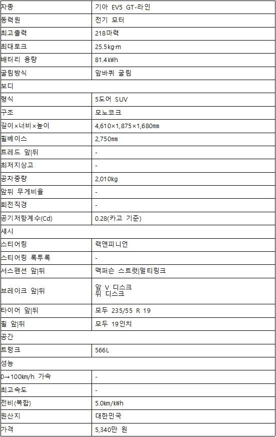 EV5의 길이와 너비, 높이는 각각 4,610×1,875×1,680㎜(GT-라인 기준). 휠베이스는 2,750㎜다. EV3와 비교하면 길이와 휠베이스가 300, 70㎜씩 길다. 기아의 내연기관 SUV인 스포티지보단 전장이 75㎜ 짧은데, 휠베이스는 고작 5㎜ 모자라다. 대부분의 소비자들이 ‘패밀리카의 시작점’쯤으로 여기는 사이즈다. 공차중량은 19인치 휠 기준 2,010㎏.