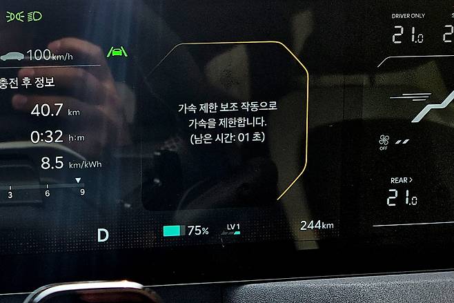 가속력은 무난한 편. 고속도로에서도 앞 차를 편안하게 추월할 수 있는 수준이다. 그런데 저속에서 가속 페달을 끝까지 밟아보니 계기판에 처음 보는 경고 문구가 나타났다. EV5에 새로 들어간 ‘가속 제한 보조’ 기능이다. 시속 80㎞ 미만으로 주행 중 가속 페달을 깊고 오래 밟았을 때 ‘비정상적인 가속’으로 판단, 음성 안내와 함께 몇 초 내로 출력을 제한한다.