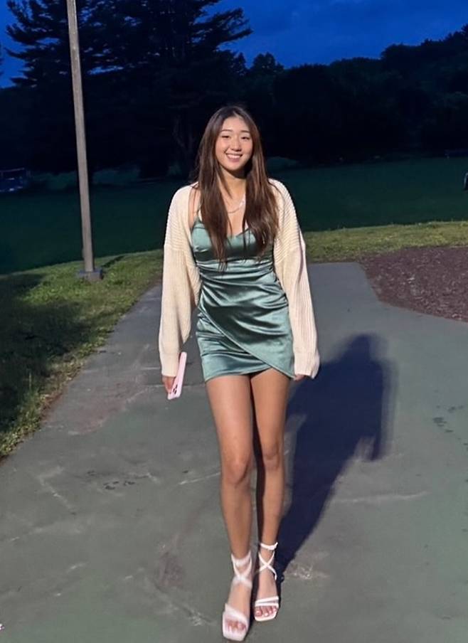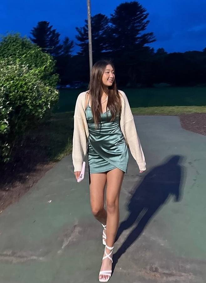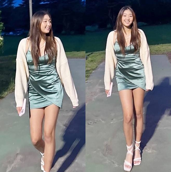 공개한 사진에서 윤라임은 늘씬한 기럭지와 각선미가 돋보이는 그린 컬러의 미니 시폰 나시 원피스를 입고 니트 카디건을 걸친 산책룩으로 엄마를 쏙 빼닮은 풋풋하면서도 러블리한 여고생 미모를 드러냈다.