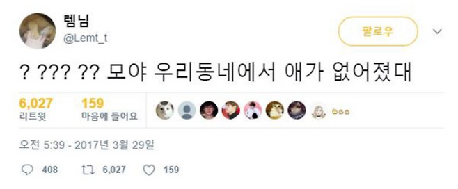 ? ??? ??? 모야 우리 동네에서 애가 없어졌대