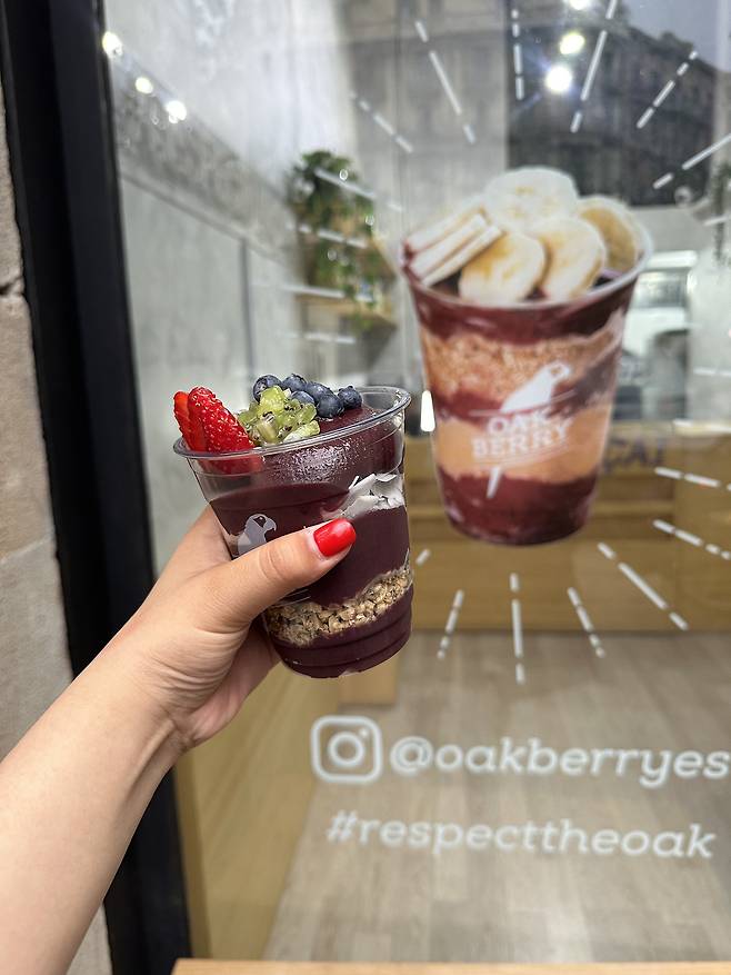 전반적으로 매장 사이즈가 되게 작아요. 테이크아웃과 배달 중심의 매장이고, 컵 형태로 어디서든 간단히, 또 가볍게 한끼 식사를 즐길 수 있다 보니 코로나기간에 굉장히 선풍적인 인기를 끌면서 스페인 바르셀로나와 마드리드에 퍼졌다고 해요. 그렇다면 요 아사이볼, 과연 어떤 음식일까요?