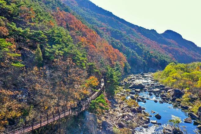 충북 영동의 대표 산책 명소인 월류봉 둘레길은 석천을 따라 이어지는 8.4km 코스로 누구나 편하게 걸을 수 있는 데크길과 맑은 물길 풍경이 특징이다.