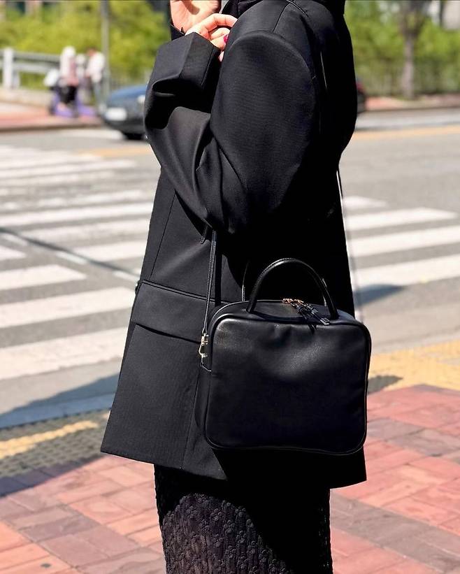 포인트 액세서리로는 블랙 미니백을 선택했다. 사각 형태의 단정한 디자인과 미니멀한 골드 지퍼 디테일이 재킷과 스커트의 스타일을 깔끔하게 정리해주면서도, 전체적인 블랙톤 스타일링에 깊이를 더하는 역할을 했다. 또한 볼드한 액세서리 없이도 강성연 특유의 분위기와 스타일이 자연스럽게 살아나 더욱 눈길을 끌었다.