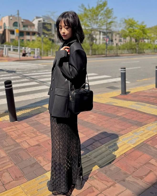 강성연의 이번 스타일링은 군더더기 없이 깔끔한 블랙 컬러를 중심으로 완성됐다. 상의로 선택한 블랙 재킷은 여유 있는 핏과 구조적인 실루엣이 특징이다. 커다란 포켓 디테일과 매트한 소재감이 도시적인 느낌을 더하며, 간결한 버튼 여밈이 전체적으로 고급스러운 무드를 자아낸다. 여기에 매치한 블랙 시스루 스커트는 섬세한 레이스 패턴이 돋보이며, 움직일 때마다 자연스럽게 퍼지는 실루엣이 우아함을 배가시켰다. 스커트 아래로 살짝 드러나는 레이어드는 감각적인 스타일 완성도를 높여주었다.