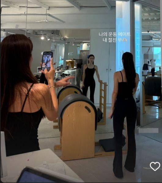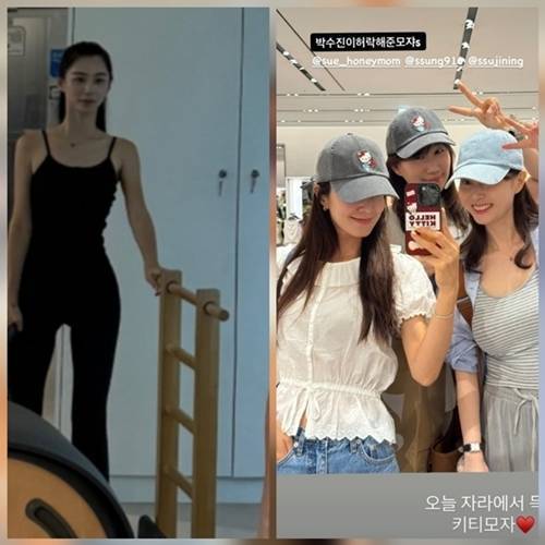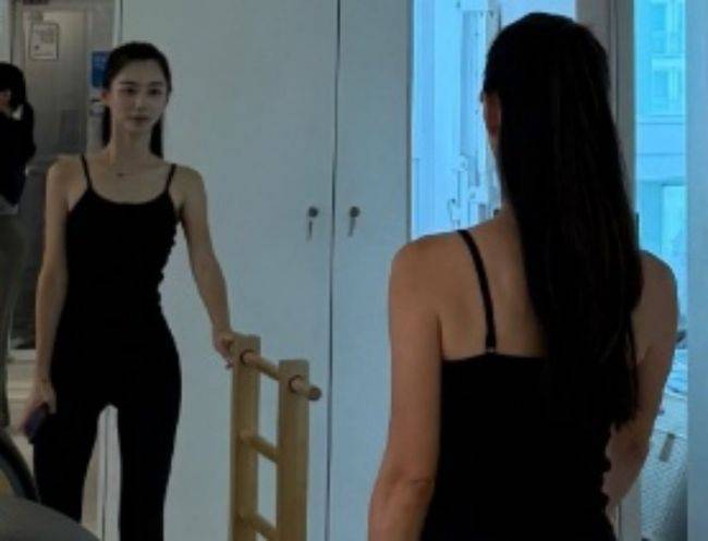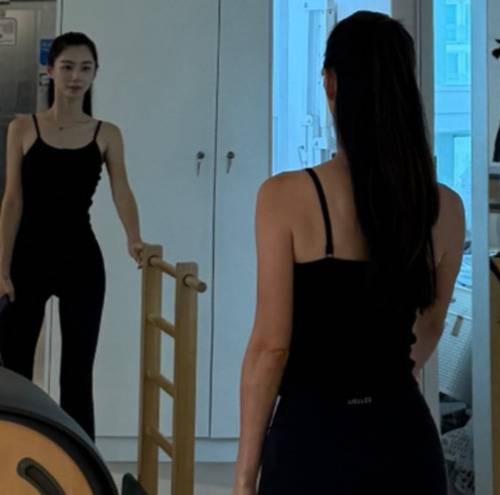 박수진은 블랙 레깅스에 민소매 상의를 매치하고 거울 앞에서 포즈를 취하고 있다. 자연스럽게 묶은 중단발 헤어스타일이 박수진 특유의 우아한 분위기를 한층 더했다.