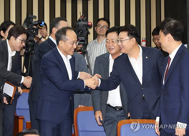 (서울=연합뉴스) 신준희 기자 = 코로나19 자가격리를 마치고 복귀한 국민의힘 추경호 원내대표가 28일 국회에서 열리는 의원총회에 입장하며 의원들과 인사하고 있다. 2024.8.28
