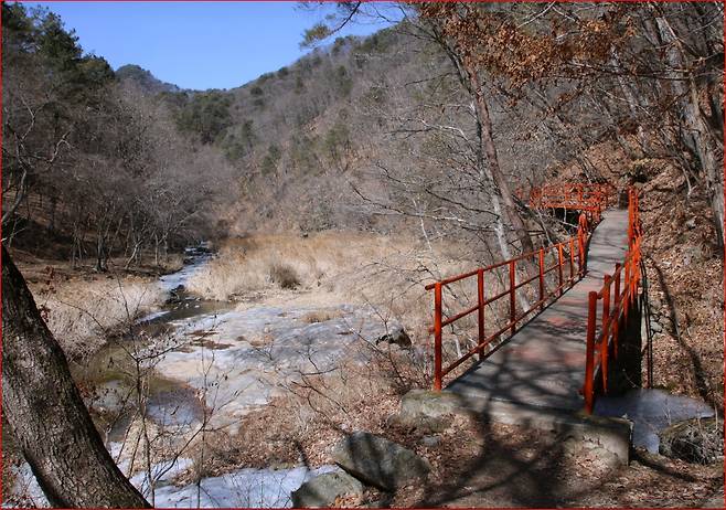 길은 흙길 위주로 조성되어 있고 경사가 완만해, 겨울에도 비교적 안전하게 걸을 수 있습니다. 중간에 만나는 ‘귕소’ 구간에서는 계곡 암반이 만들어낸 독특한 지형과 출렁다리를 함께 경험할 수 있어, 짧지만 인상적인 포인트가 됩니다.