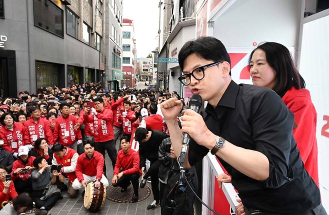 | ▲ 국민의힘 한동훈 비상대책위원장 겸 총괄 선거대책위원장이 3일 강원 춘천 명동에서 김혜란(강원 춘천시철원군화천군양구군갑) 후보, 한기호(강원 춘천시철원군화천군양구군을) 후보의 지지를 호소하고 있다. 2024.4.3 [공동취재] |
