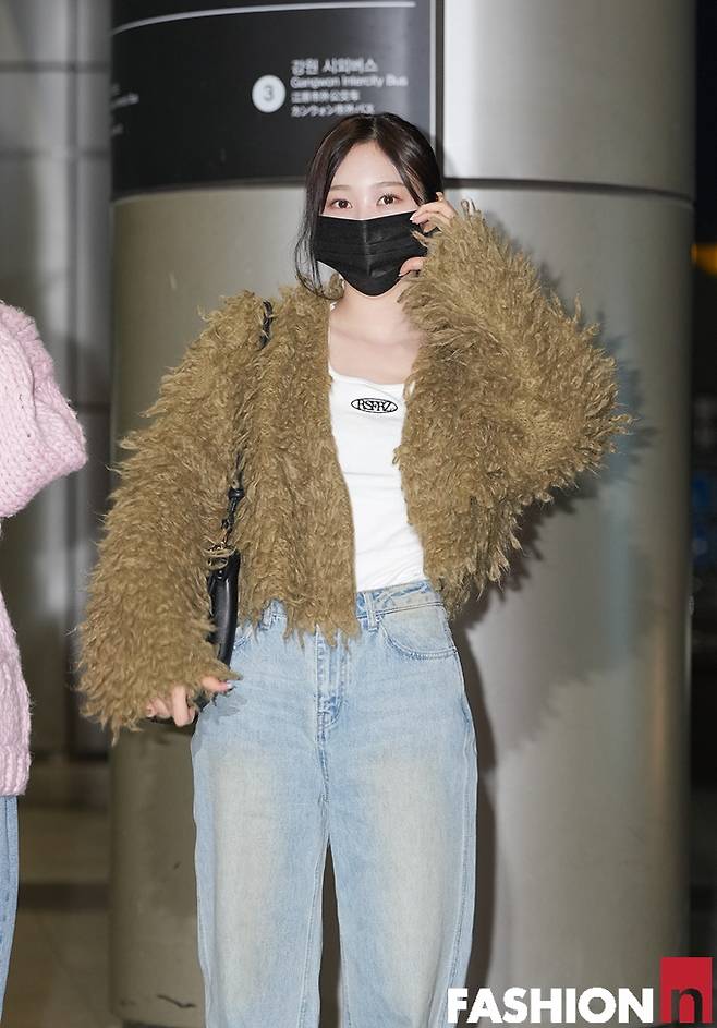 이날 지젤은 데님 팬츠에 볼레로 시어링 재킷을, 윈터는 더플코트를, 닝닝은 체크 스커트와 탱크톱에 블랙 집업 재킷을, 카리나는 데님 팬츠와 화이트 티셔츠에 핑크 크로셰 니트 카디건을 걸치고 4인4색 개성만점 출국룩으로 시선을 사로잡았다.