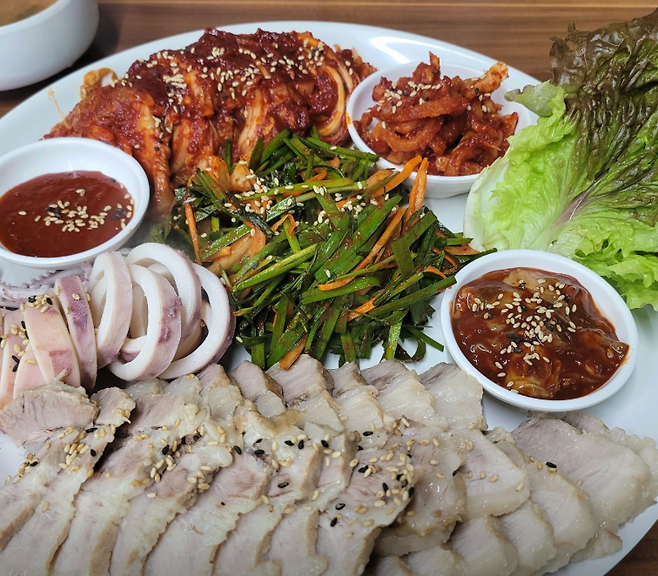 ▶ 두툼하고 야들야들한 오징어 숙회까지 더해져 입안에서 부드럽게 씹히는 조합이 정말 잘 어울려요.
