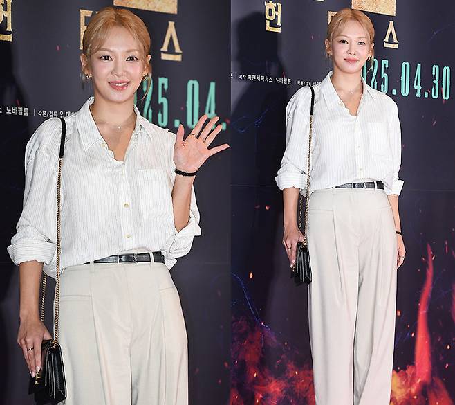 효연은 은은한 스트라이프 패턴이 더해진 화이트 셔츠를 여유롭게 롤업해 내추럴한 멋을 살렸으며, 여기에 베이지 톤의 와이드 팬츠를 매치해 모던하고 깔끔한 오피스룩을 완성했습니다.