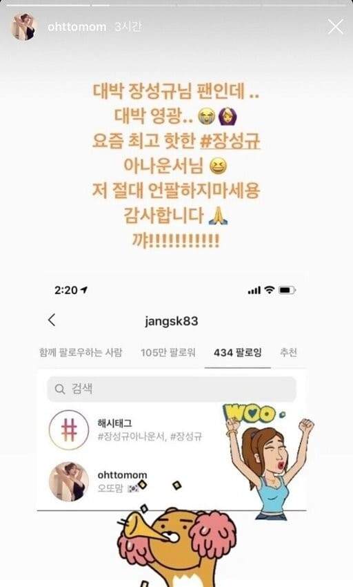 오또맘은 본인의 SNS 계정에 '대박 장성규 님 팬인데 대박 영광, 요즘 최고 핫한 장성규 아나운서님 저 절대 언팔 하지 마세요. 감사합니다'라는 글을 게시했습니다.