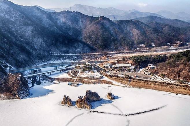 충청북도 단양군 매포읍 삼봉로 644에 위치한 ‘도담삼봉’은 3개의 기암으로 이루어진 섬이다. 겨울철에 방문하면 꽁꽁 얼어붙은 강물과 그 사이 우뚝 솟은 기암이 어우러지는 풍경을 감상할 수 있다.
