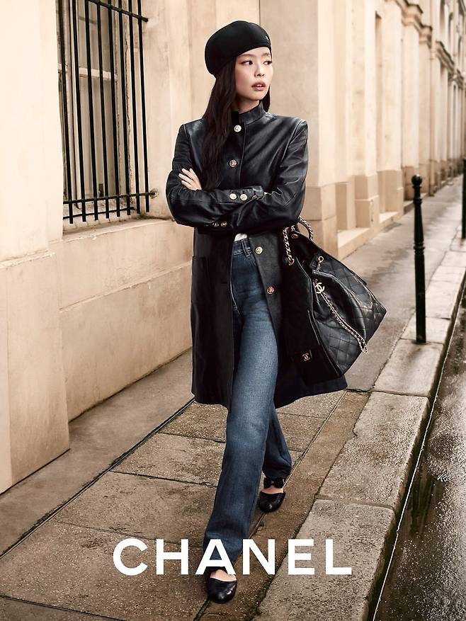 블랙 레더 코트와 데님 팬츠, 베레모로 완성한 파리지엔 스타일을 연출하고 있다. 샤넬 퀼팅 백과 블랙 펌프스를 매치해 럭셔리함을 더했으며, 고풍스러운 건물 앞에서의 포즈는 클래식한 유럽풍 감성을 완벽하게 표현하고 있다.