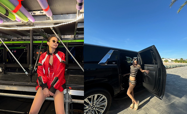 스트라이프 패턴의 니트 투피스 세트로 리조트 스타일을 선보이고 있다. 크롭톱과 미니스커트의 조합은 건강한 섹시미를 드러내며, 베이지 톤의 슬라이드 샌들과 블랙 SUV를 배경으로 한 세팅은 럭셔리한 휴가 분위기를 자아내고 있다.