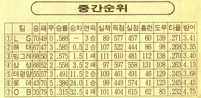하지만 오히려 1위(해태)와 4위(빙그레)가 1게임차 이내로 촘촘히 늘어서면서 역대급 막판 순위 경쟁을 예고했다. LG로서는 남은 경기를 다 이겨놓고 경쟁팀들의 전적을 살펴보는 수밖에 없었다.