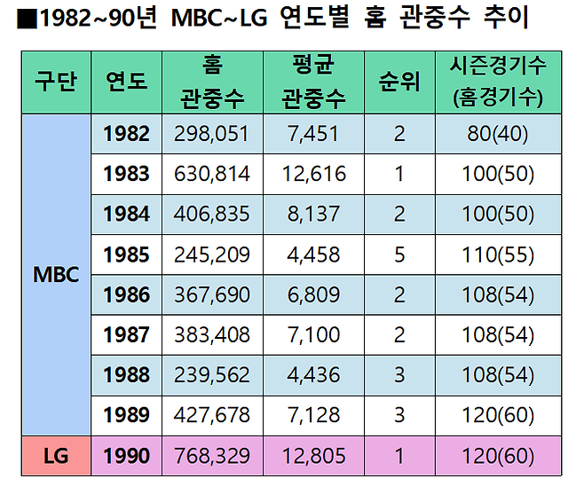 당시 같은 잠실을 쓰는 OB의 역대 한 시즌 최다 관중수는 1989년의 43만6026명. 롯데가 1990년 65만4950명으로 구단 자체적인 최다관중수 기록을 세웠다는 점과 비교해보면 LG의 76만 관중수는 당시로선 깜짝 놀랄 만한 수치였다.