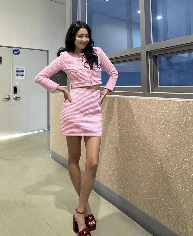 짧은 크롭 기장의 상의와 몸매를 그대로 드러내주는 짧은 스커트 덕분에 그녀가 가진 황금 골반이 자연스럽게 강조되는 룩이네요.