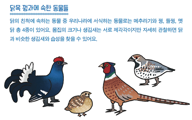 멧닭은 ‘산’의 옛말인 ‘메’와 ‘닭’이 합쳐진 이름으로, 말 그대로 산에 사는 닭을 말해요. 멧닭은 이름뿐만 아니라 생김새나 습성도 닭과 비슷한 면이 있지요. 머리에 드러난 붉은 피부는 마치 닭벼슬처럼 보여요. 또 ‘구구구’ 하고 우는 소리도 닭과 비슷해요. 하지만 멧닭은 닭보다 몸집이 더 크고, 몸집에 비해 머리는 작은 편이지요.