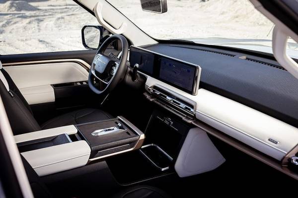 전면에는 Maxus 영문 레터링이 큼지막하게 달려 있다. 실내에는 2개의 12.3인치 독립형 디스플레이가 돋보인다. 플로팅 센터 콘솔, 투톤 가죽, 투 스포크 플랫 바텀 스티어링 휠, 메탈릭 마감 처리로 고급스러운 느낌을 준다.