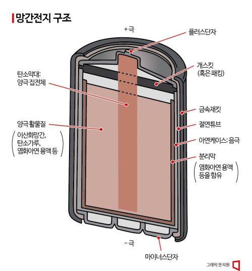 이후 망간 건전지지는 음극 역할을 하는 아연 금속이 원통을 둘러싸는 형태로 개선됐다. 망간건전지의 가장 바깥쪽의 금속 외장을 뜯어보면 절연체가 둘러싸고 있으며 그 안에 원통형의 아연 케이스와 분리막, 양극활물질이 차례로 들어 있다. 중심에 탄소 막대가 자리하고 있다.