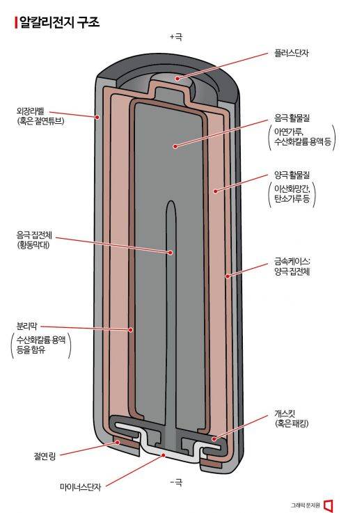 알칼리전지도 망간을 사용하고 있기 때문에 넓게 보면 망간 전지의 일종이라고 할 수 있다. 하지만 알칼리 전지의 구조는 기존 망간 전지와 정반대다. 금속 케이스가 양극 집전체 역할을 하며 그 안에 양극활물질, 음극활물질이 차례로 들어 있다. 중심에는 음극집전체 역할을 하는 황동 막대가 들어 있다. 음극 활물질에 포함된 아연의 양이 망간 전지에 비해 많아 화학반응이 오랫동안 지속된다. 알칼리건전지는 원통형뿐만 아니라 단추형으로도 많이 판매된다.