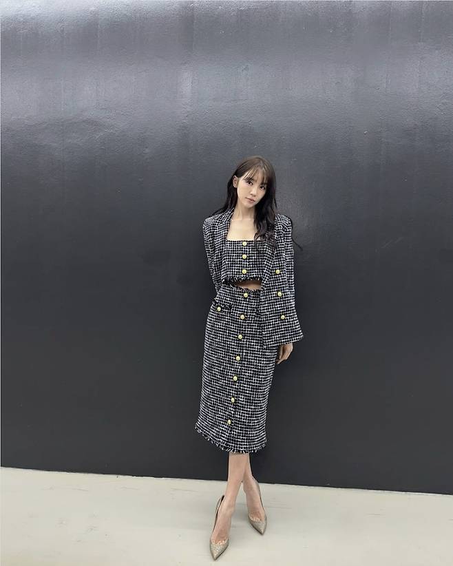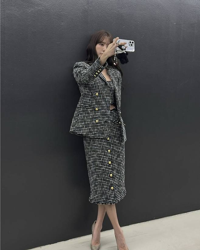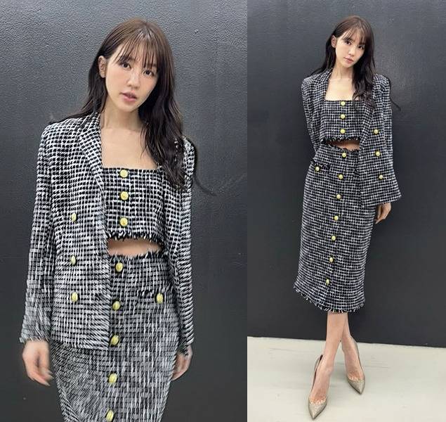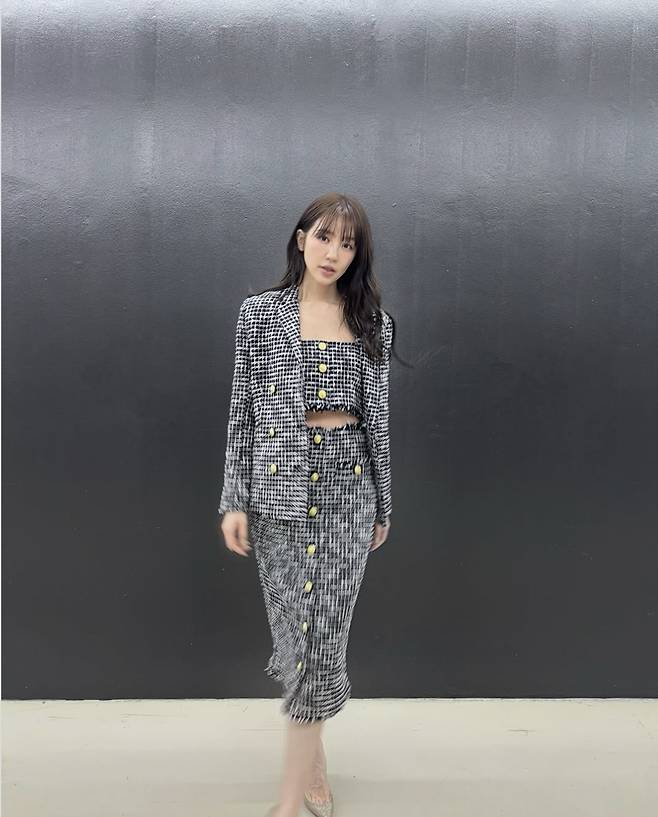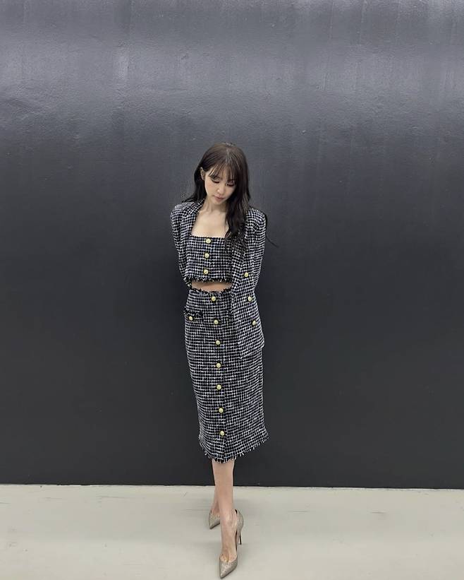 블랙 앤 화이트 체크 트위드 투피스를 입은 윤은혜는 클래식한 소재에 크롭탑 실루엣을 더해, 단아함과 세련된 섹시미를 동시에 뽐냈습니다.