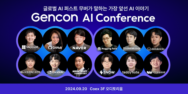 컨퍼런스는 12개 기업 소속 IT 전문가가 연사로 참여해 총 9개 세션을 진행한다. 생성형 AI(Gen AI)로 인한 업계 변화와 트렌드를 비롯해, AI 서비스를 위한 데이터셋과 클라우드 구축 방법을 다룬다. AI 산업의 급성장에 따른 투자 전망에 대해 기업과 벤처 투자자들이 의견을 공유하는 시간도 마련된다.