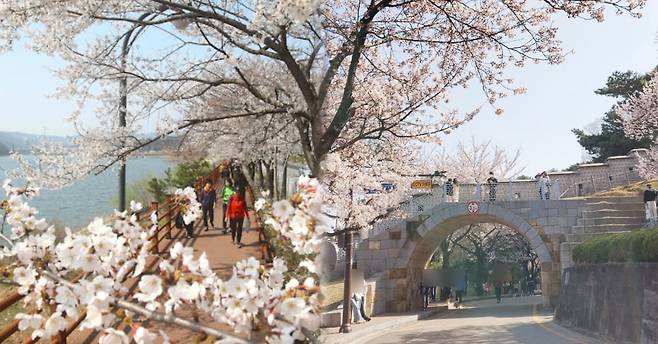인기 드라마 '스물다섯 스물하나'의 촬영지로 알려져있는 수원화성 남포루입니다. 성곽의 동그란 터널 주위로 벚꽃 나무가 심어져있어 고즈넉하면서도 낭만적인 벚꽃 풍경이 펼쳐지는 곳인데요.
