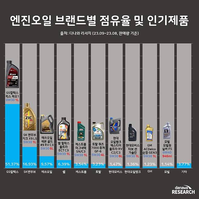 최근 1년간 가장 인기 있는 브랜드는 GS칼텍스로 51.37%의 압도적인 점유율을 기록하며 시장을 선도하고 있다. GS칼텍스는 최근 5년간 꾸준히 1위를 유지하고 있으며, 승용차부터 건설장비용 엔진오일까지 종류별 다양한 엔진오일을 판매 중이다. 대표 제품으로는 킥스 파오1 0W30 1L 8,250원 가 있다.